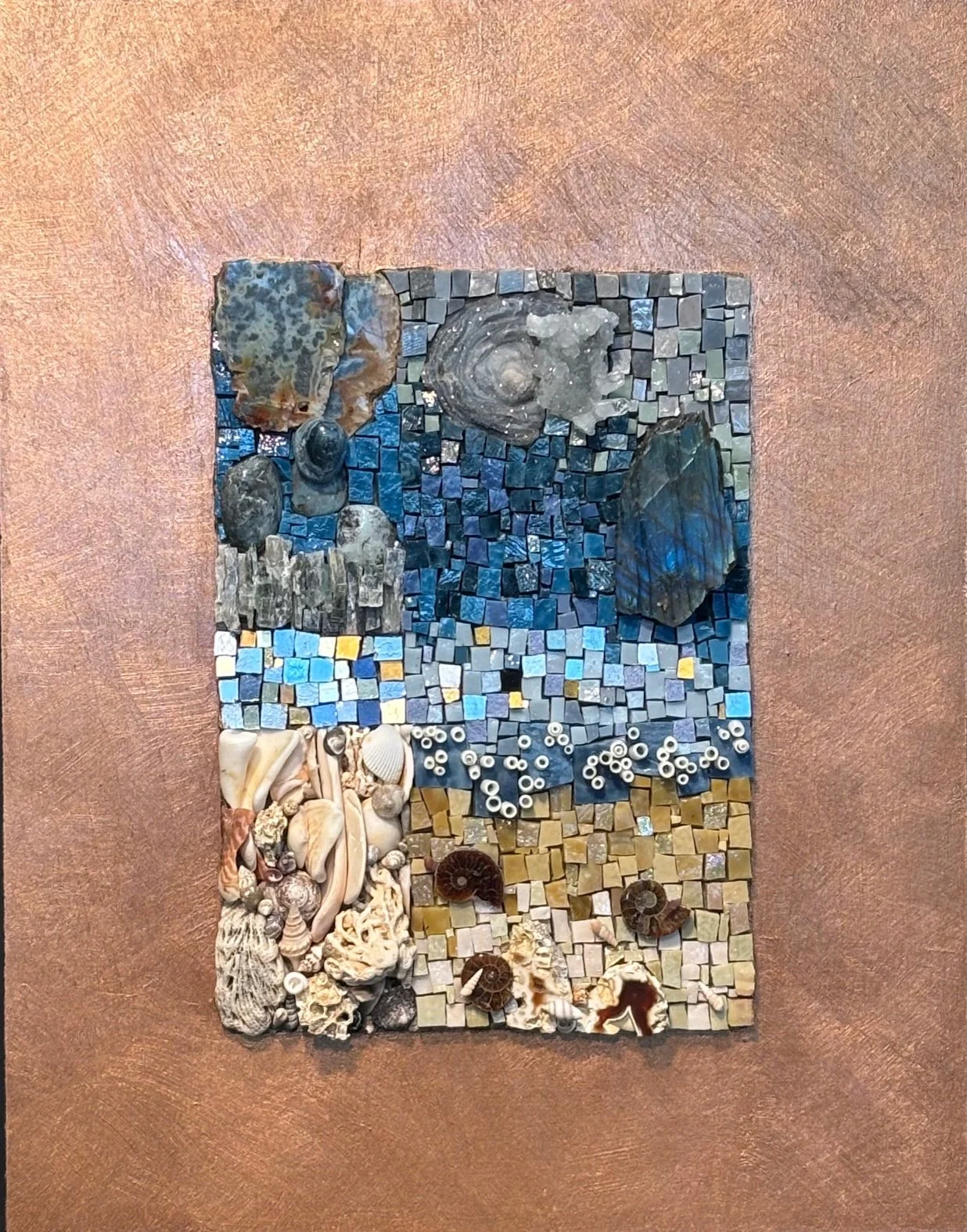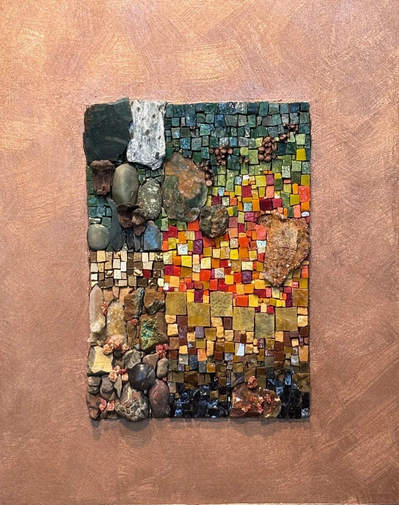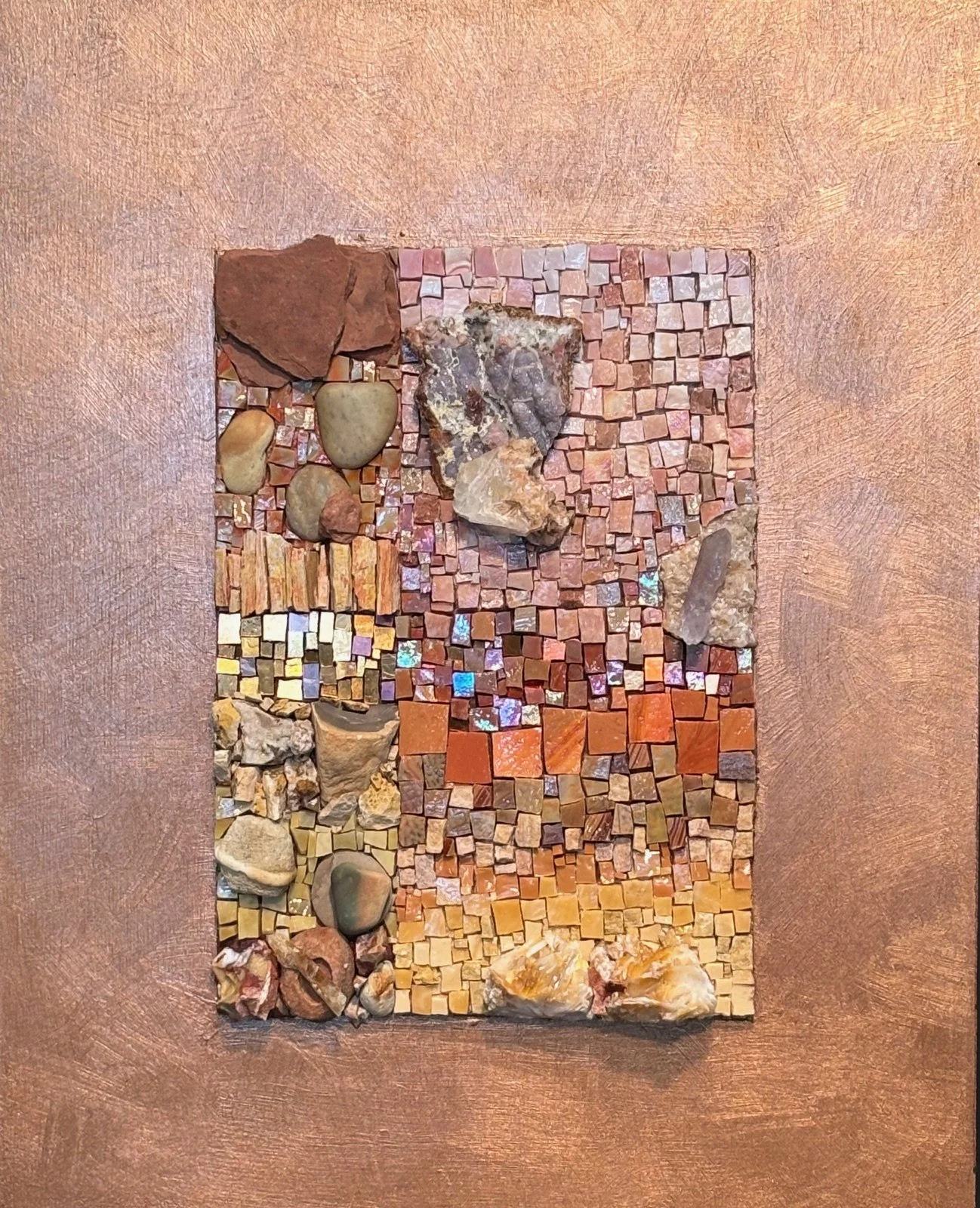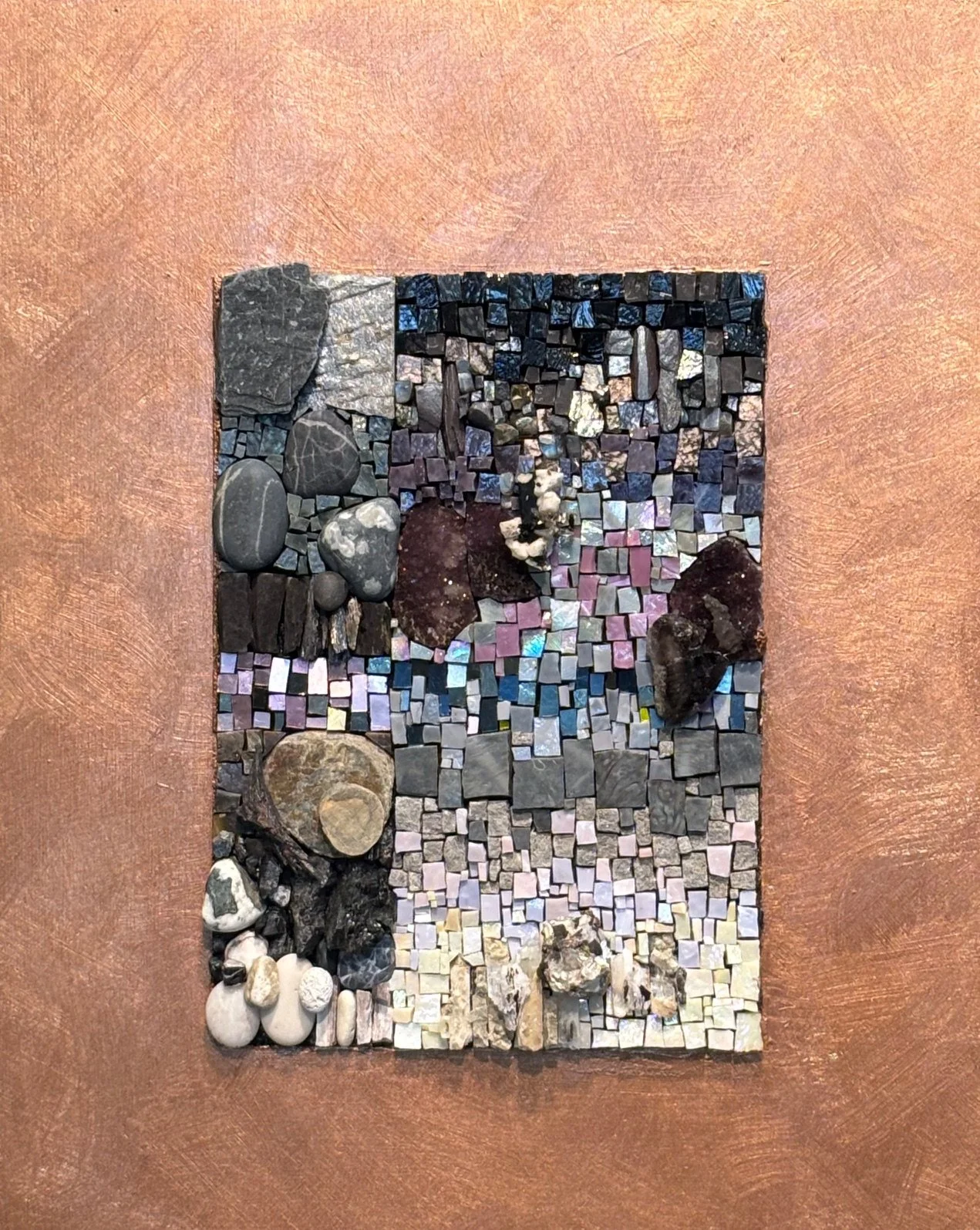 Mexican and Italian Smalti Glass, Gold Smalti, Stones from Antartica, Slate, Petrified Wood, Amethyst, Calcite, Tourmaline, Stone